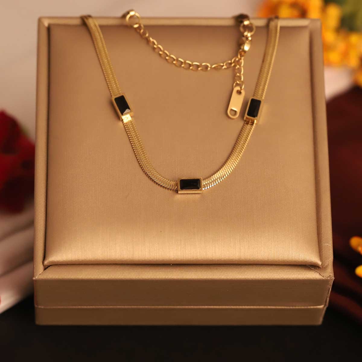 Be the first to review “Modern Gold-Plated Snake Chain with Black Rectangle Accents Necklace”