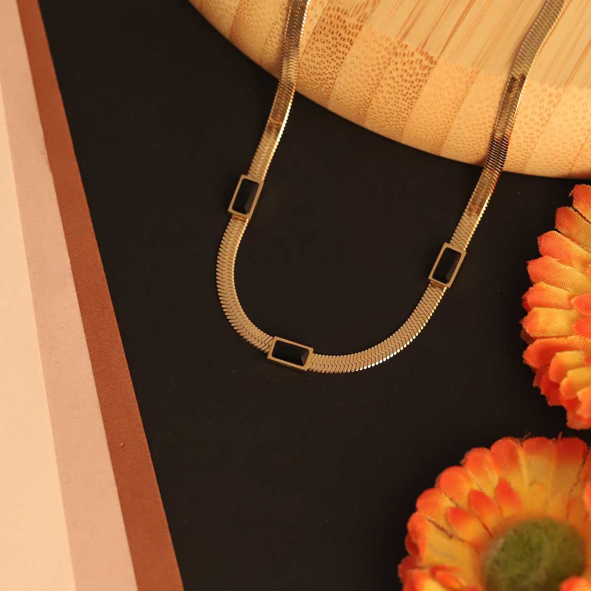 Modern Gold-Plated Snake Chain with Black Rectangle Accents Necklace