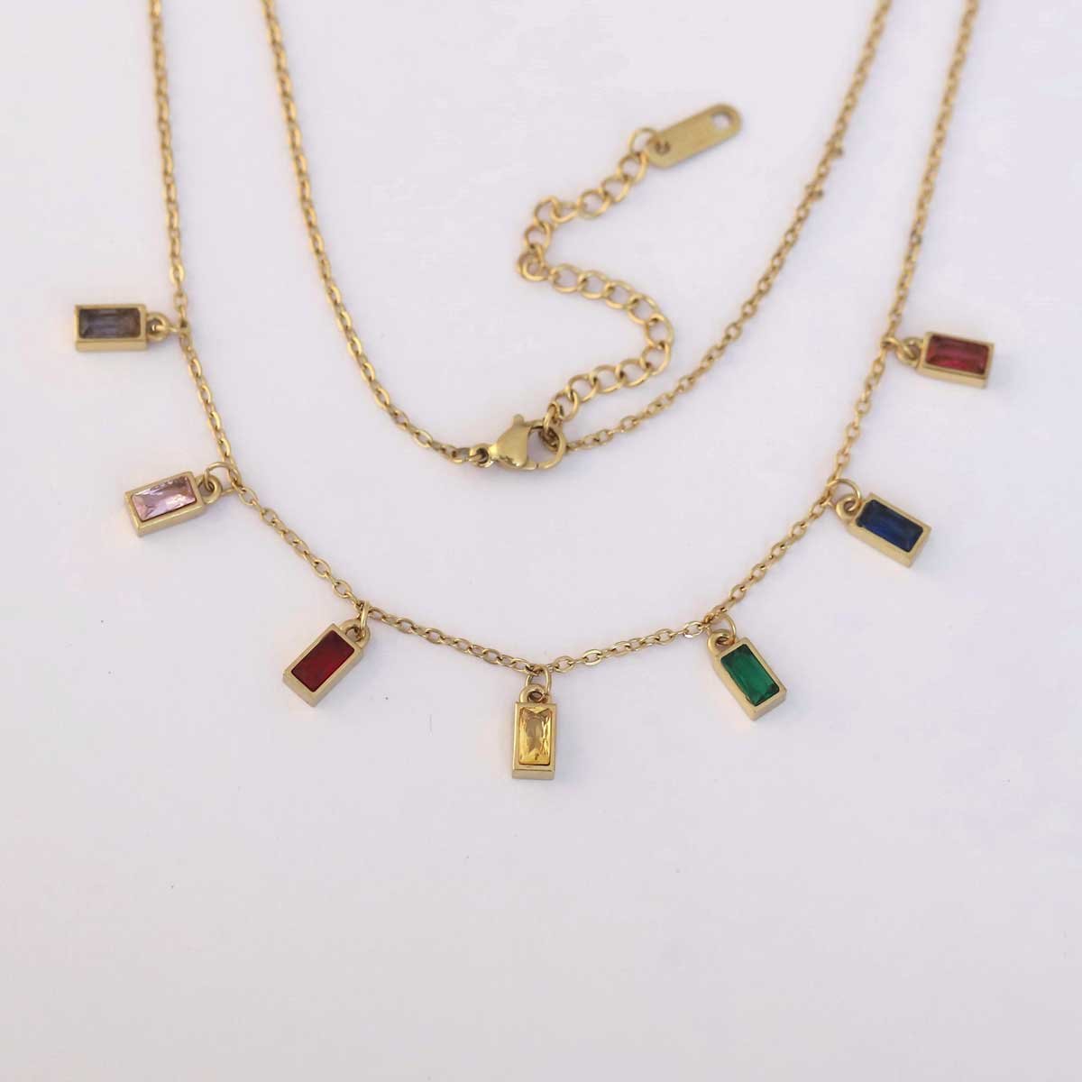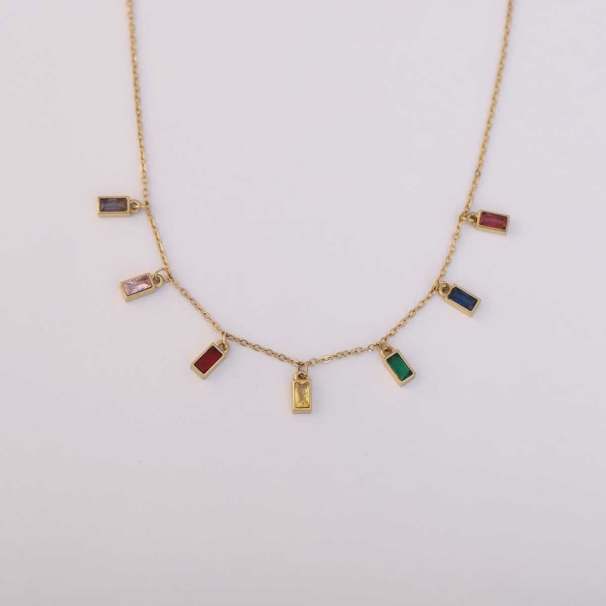 Inject a pop of color into your style with this eye-catching gold-tone choker-style necklace. The delicate chain is adorned with seven individually spaced, small rectangular artificial gemstones in an array of vibrant colors including purple, pink, red, yellow, green, blue, and a darker red. Made from durable artificial metal, this necklace is designed to sit elegantly around the neck, offering a playful yet chic statement. Perfect for adding a cheerful and fashionable touch to any outfit.